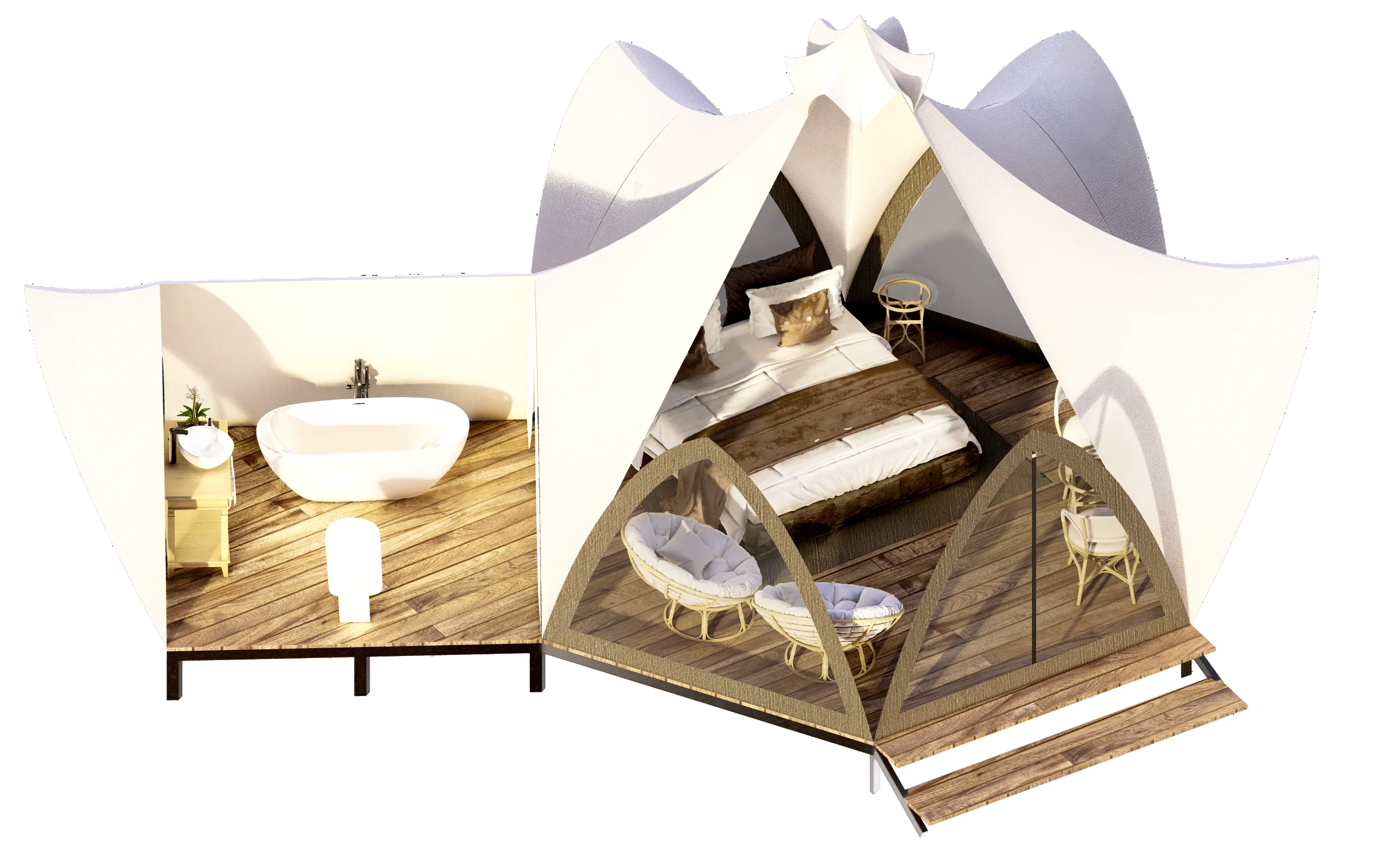 A versatile expansion that flows effortlessly from the curves of your Mandala tent, adding valuable space for sleeping, lounging, or creative multi-use layouts. Designed for long-term integration, this module blends seamlessly with the tent’s architecture, creating a unified look while delivering year-round functionality for premium glamping environments.