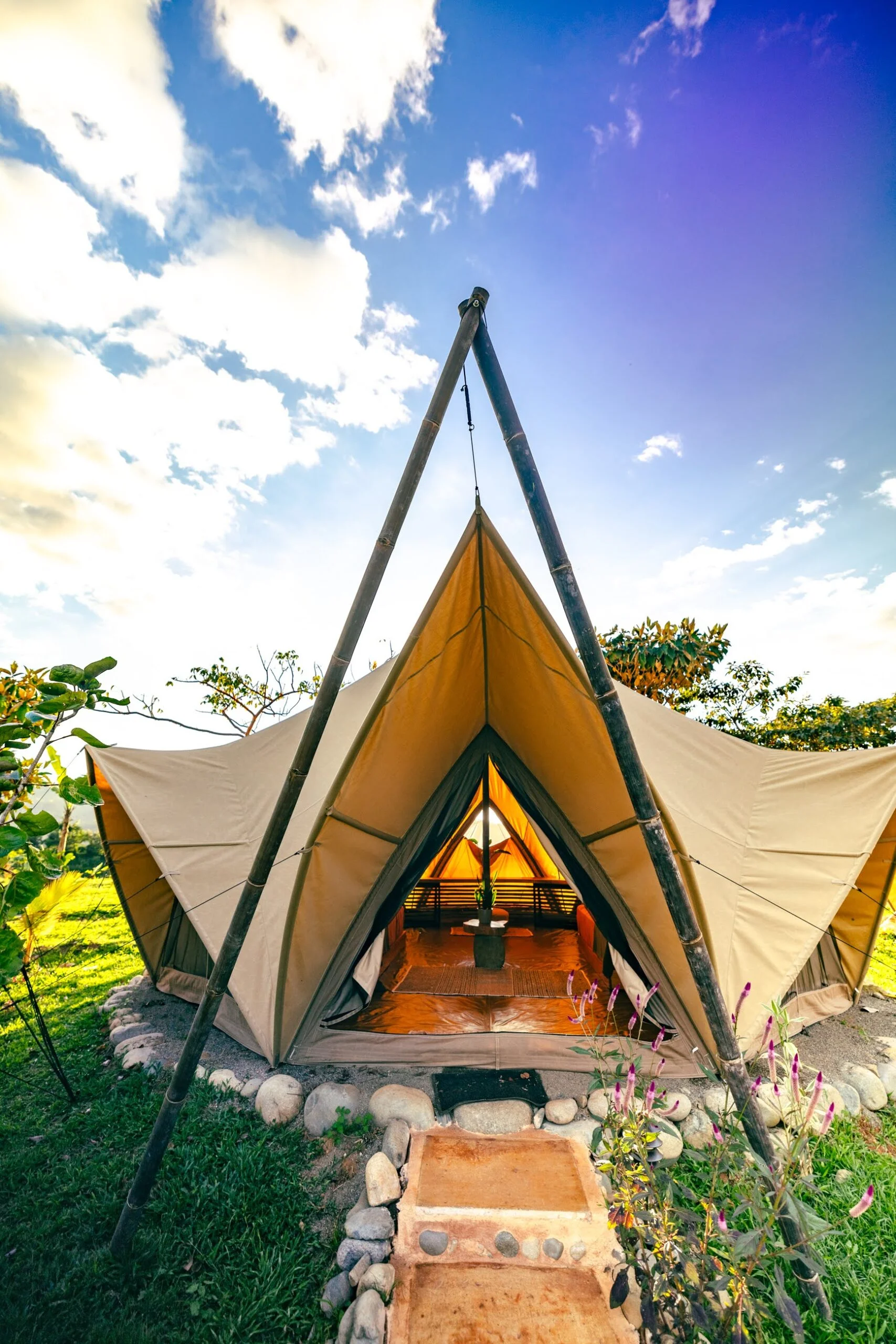 A graceful, weather-shielding canopy designed to protect and enhance tent entrances. It keeps guests comfortably dry and shaded as they enter and exit, providing essential weather protection without sacrificing style. A perfect touch for high-end glamping retreats looking to elevate their guest welcome experience, rain or shine.
