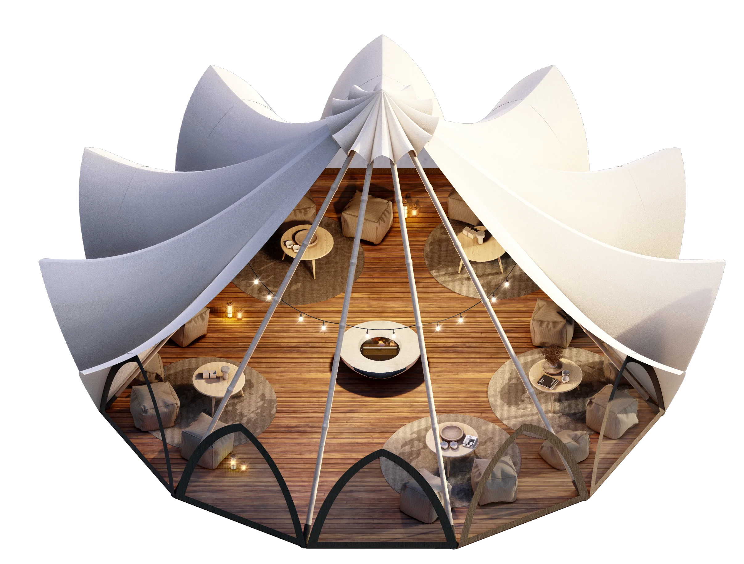 Designet for å sømløst koble sammen separate Mandala-teltstrukturer til harmoniske oppsett med flere enheter. Denne elegante forbindelsen gir uanstrengt flyt mellom rom, beskytter gjestene mot vær og vind samtidig som den bevarer den estetiske integriteten og de luksuriøse linjene til dine sammenkoblede glamping-retreat-steder. Ideell for å skape sammenhengende boopplevelser med flere rom i førsteklasses omgivelser.